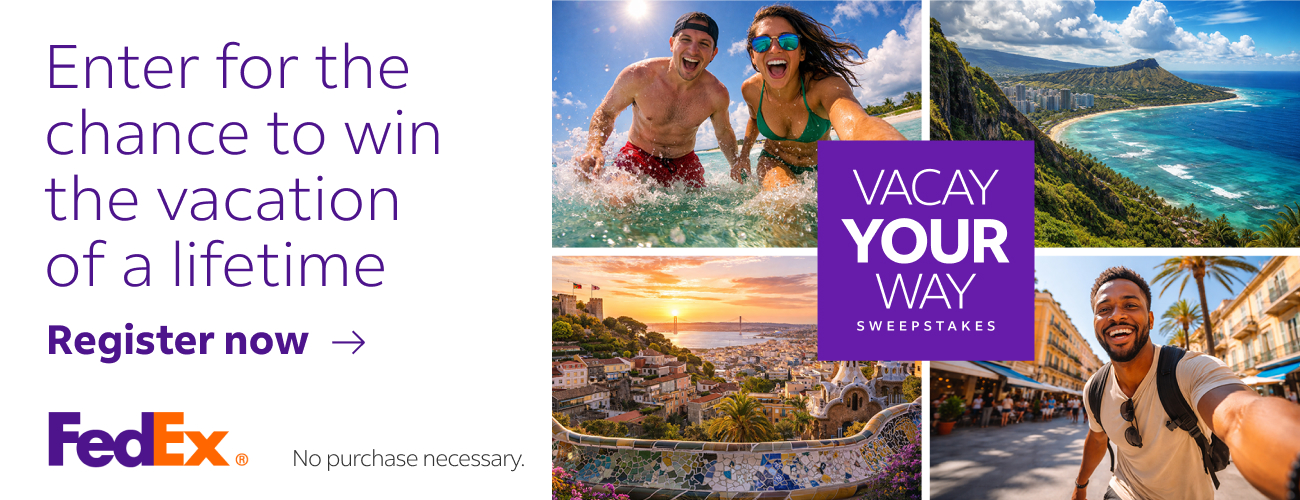 *NO PURCHASE NECESSARY. Void outside the 50 US/DC, Canada and where prohibited. FedEx Vacay Your Way 2026 Sweepstakes is sponsored by Federal Express Corporation. Open to legal residents of the 50 US/DC and Canada who have reached the age of majority in their jurisdiction of residence at the time of entry. Also open to businesses that are lawfully registered and operate in the 50 US/DC and/or Canada. The business owners or authorized employees who enter on behalf of the business must be legal residents of the 50 US/DC or Canada who have reached the age of majority in their state/jurisdiction of residence. Limit 200 total entries per participant regardless of method of entry. Begins 10:00 a.m. ET on March 10, 2026 and ends 5:00 p.m. ET on May 29, 2026. Two (2) Grand Prizes available to be won with an Approximate Retail Value (“ARV”) of USD $12,000 each. One (1) First Prize available to be won with an ARV of USD $5,000. One (1) Second Prize available to be won with an ARV of USD $2,500. Two (2) Weekend Getaway Prizes available to be won with an ARV of USD $3,200 each. Skill testing question required to win a prize for Canadian winners. Odds of winning depend on total number of eligible entries received. For Official Rules, visit www.fedex.com/vacay.